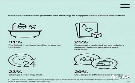 報(bào)告指出,有八成以上的家長(zhǎng)為了孩子的成功而做出不同程度的個(gè)人犧牲,包括減少對(duì)自己愛好的投入時(shí)間,放棄自己的娛樂(lè)時(shí)間,改變自己的工作模式,為了小孩有更好的將來(lái)、家長(zhǎng)去發(fā)展對(duì)小孩有利的社交圈子等等。